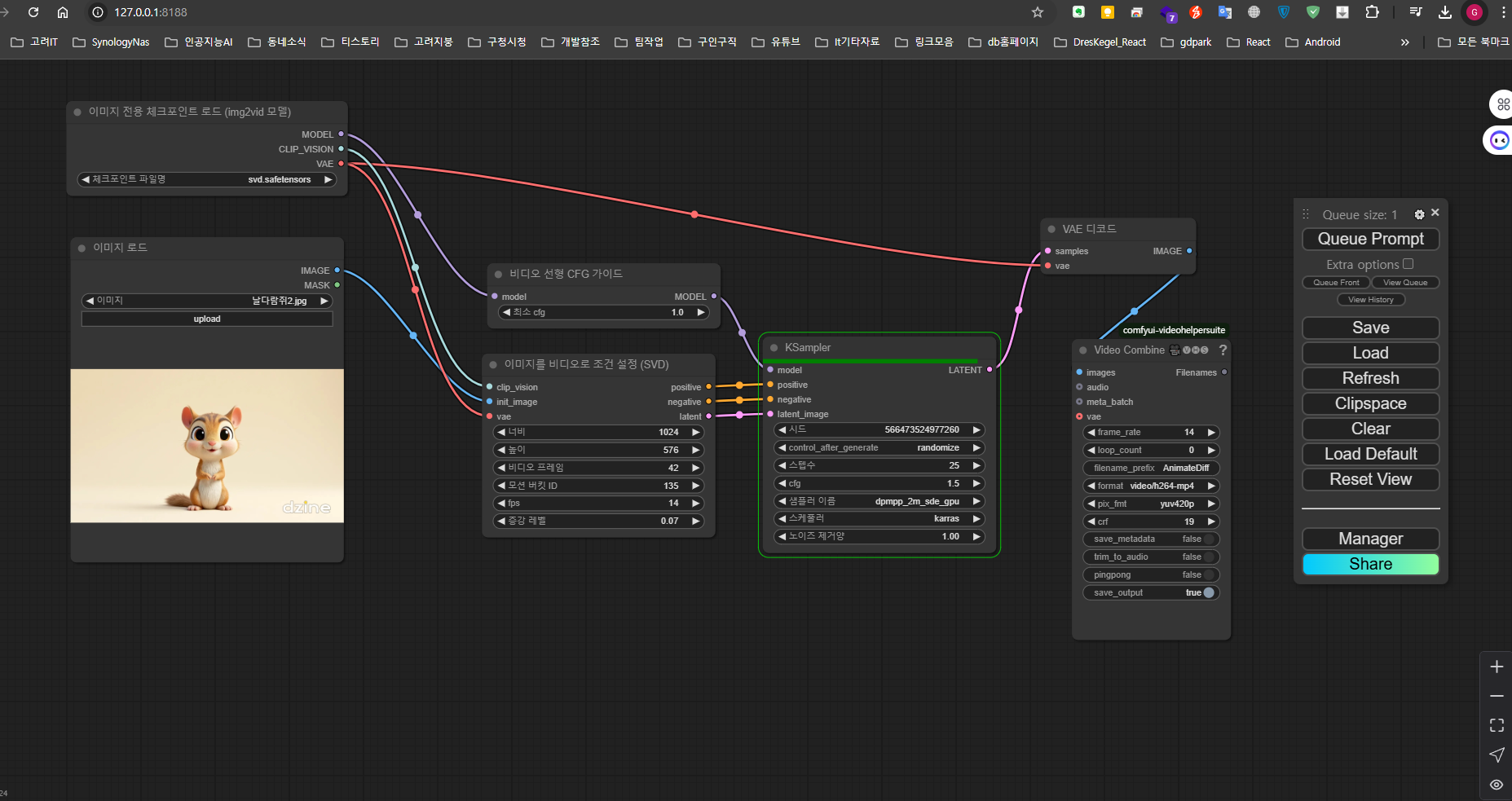 하지만 포기하지 않고 튜토리얼 영상과 샘플 워크플로우를 참고하며 차근차근 배워나갔습니다. 텍스트로 귀여운 다람쥐를 묘사하고, 모션을 적용하기 위한 노드들을 연결했습니다. "주황색 털의 귀여운 다람쥐가 나무 위를 뛰어다니는" 모습을 구현하기 위해 프롬프트를 여러 번 수정하고, 적절한 모델을 선택하느라 많은 시간을 투자했습니다.