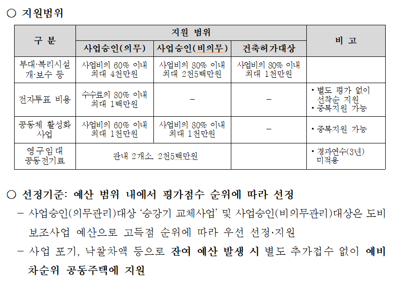 ※ 전자투표 수수료 및 영구임대아파트 공용전기료 지원은 준공 경과 연수 및 재지원 기간 제한 미적용