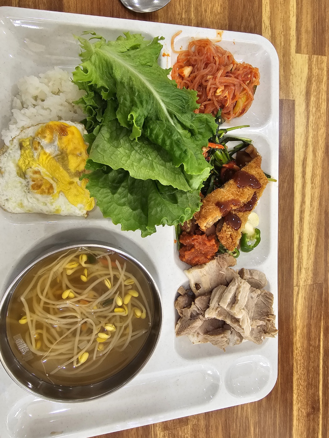 제가 직접 담아온 접시 좀 보세요! 갓 지은 따끈한 밥 위에 신선한 상추, 고소한 계란 프라이, 그리고 갓 튀겨 바삭한 돈가스까지! 여기에 다양한 종류의 김치와 나물, 그리고 부드러운 수육까지 더해지니 그야말로 완벽한 한 상이었습니다. 특히, 뷔페에서 만날 수 있는 이 푸짐한 구성은 정말 감동 그 자체였어요. 콩나물국까지 함께하니 속까지 든든하고 따뜻했습니다.