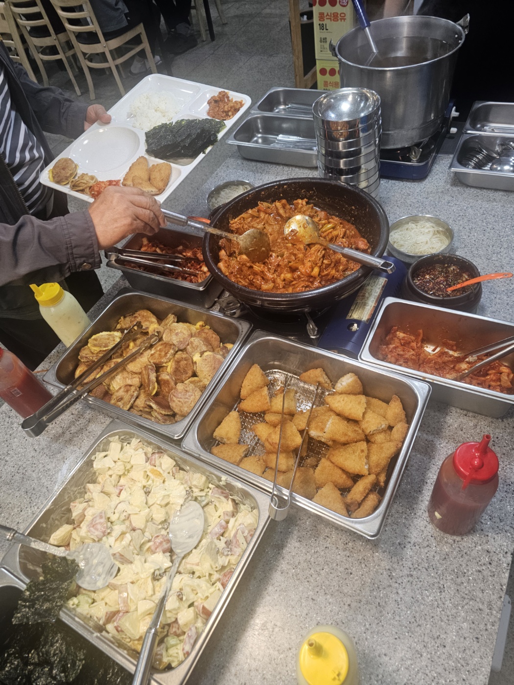 {사진 : 음식 초기세팅 또는 전체 상차림 - 대상사진 : 개인 접시에 담긴 푸짐한 한식 뷔페 음식들. 밥과 상추, 계란 프라이, 다양한 종류의 반찬, 고기, 튀김, 그리고 콩나물국이 담겨 있다.}